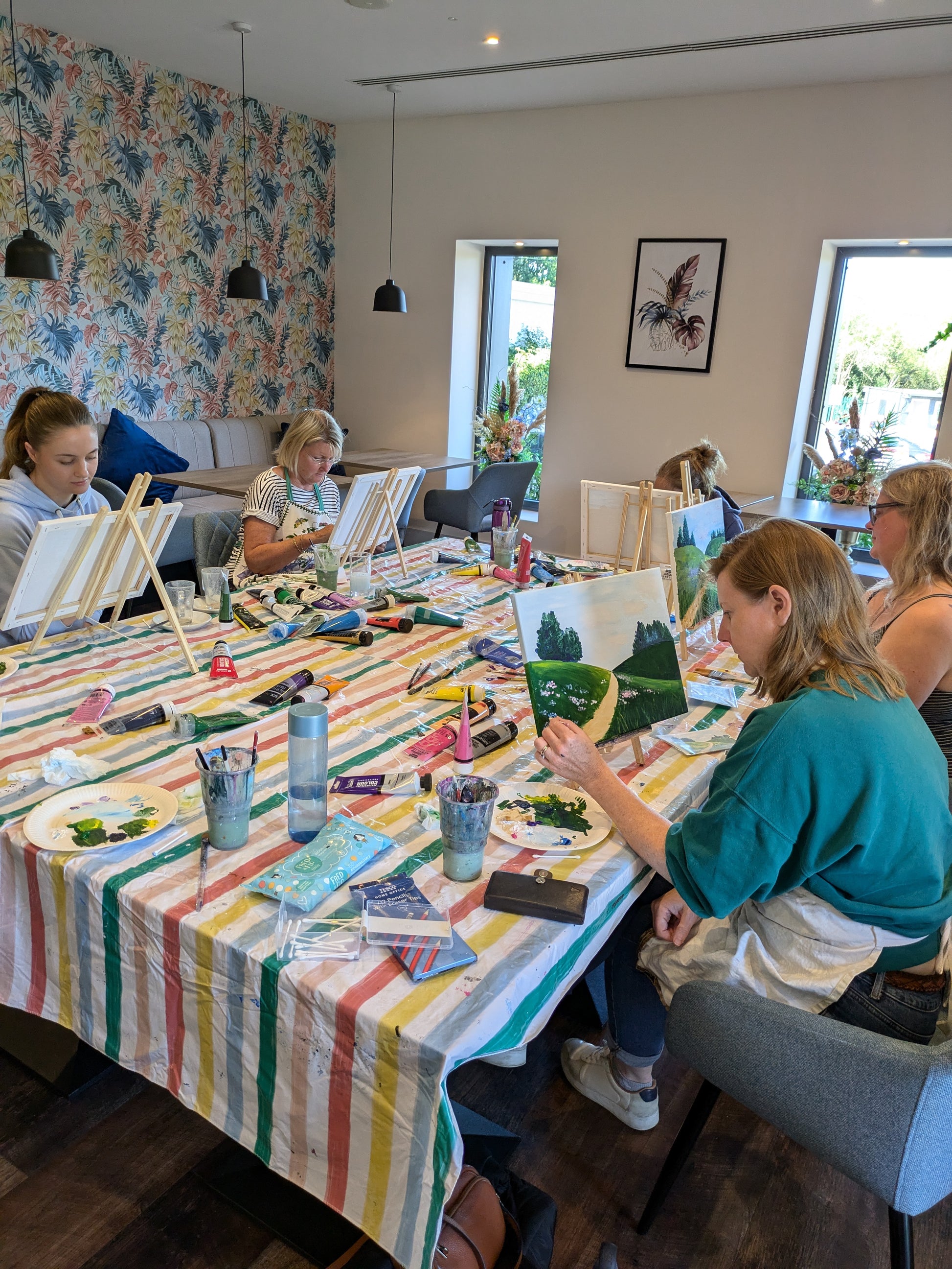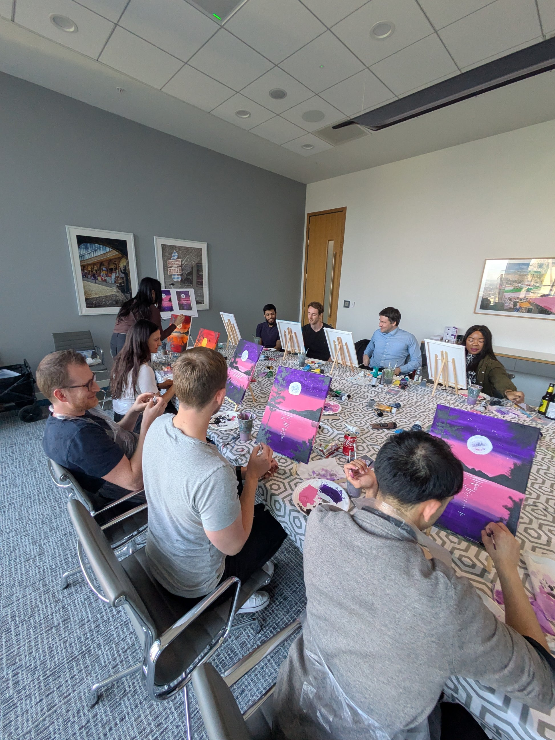 Everyone will paint a picture on canvas with step-by-step demonstration, meaning everyone can have a good go, whatever their previous painting experience. The team will experience colour mixing, composition advice, mindful painting and have a chance to try out different painting techniques. You will be able to choose the painting your team complete from a menu of choices (or contact me about bespoke themes).