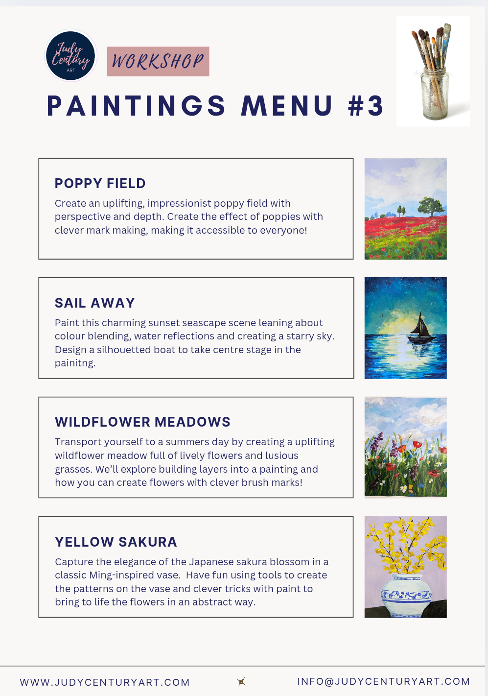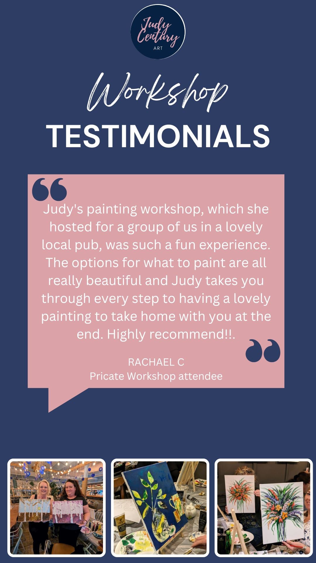 All materials are provided, and all abilities are welcome. I will contact you to discuss the theme of the painting class and any specific requirements you may have. Feel free to chat to me to discuss you booking by emailing info@judycenturyart.com.