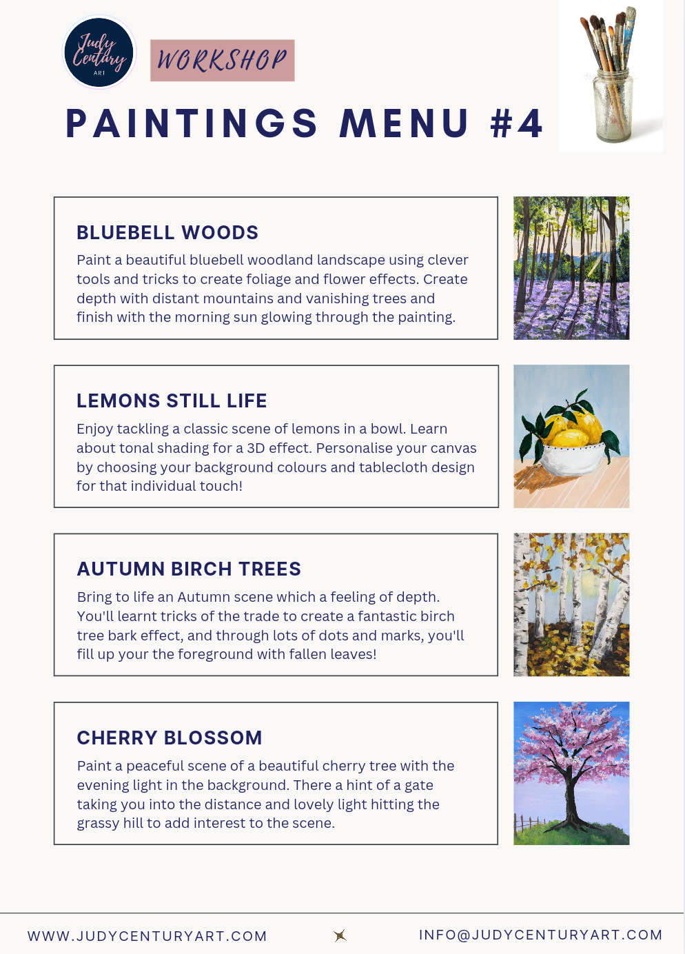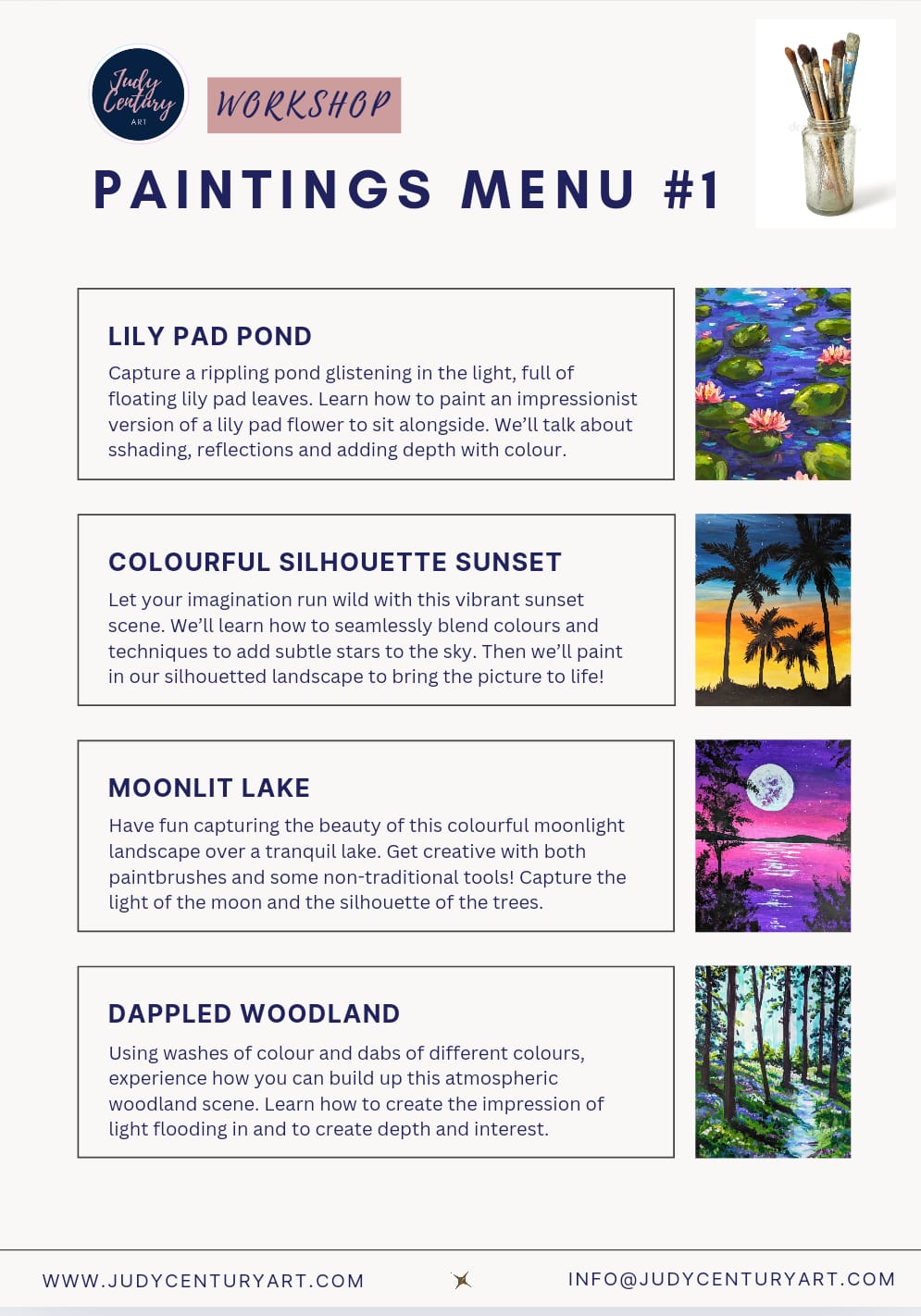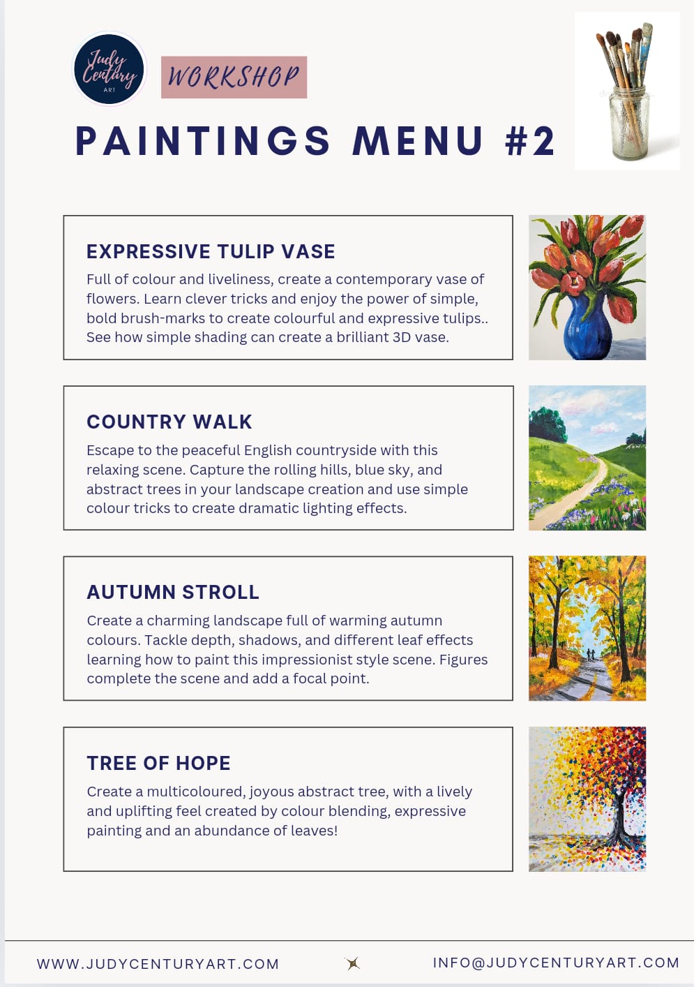 All materials are provided, and all abilities are welcome. I will contact you to discuss the theme of the painting class, the time and date, and any specific requirements you may have. You can select from a step-by-step session where everyone paints the same picture, with demonstration by Judy at each step, or a more freestyle event with a common theme guided by Judy, but where everyone produces their own creation. The painting menu is included here in the event photos. Feel free to chat to me to discuss you booking by emailing info@judycenturyart.com.