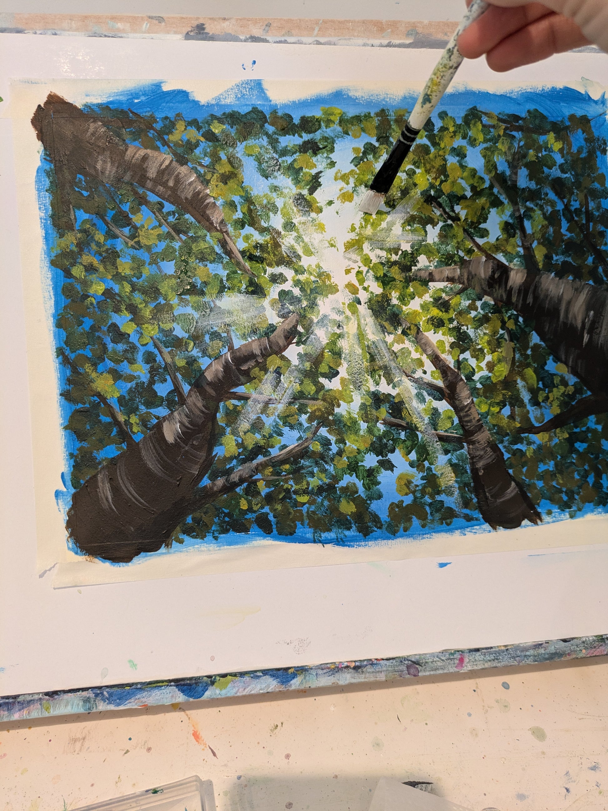 Escape to the great outdoors and look up to the sun streaming through the forest canopy. Join me to paint a fun forest perspective to create the effect of looking up to the tops of trees with the sunlight breaking through. With easy step-by-step guidance, you'll learn to create this atmospheric landscape with textured, shady trees and light tinged leaves.