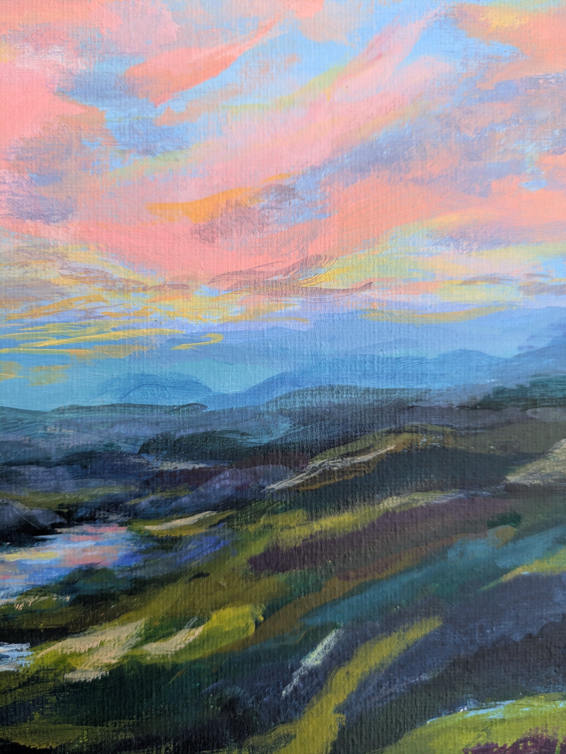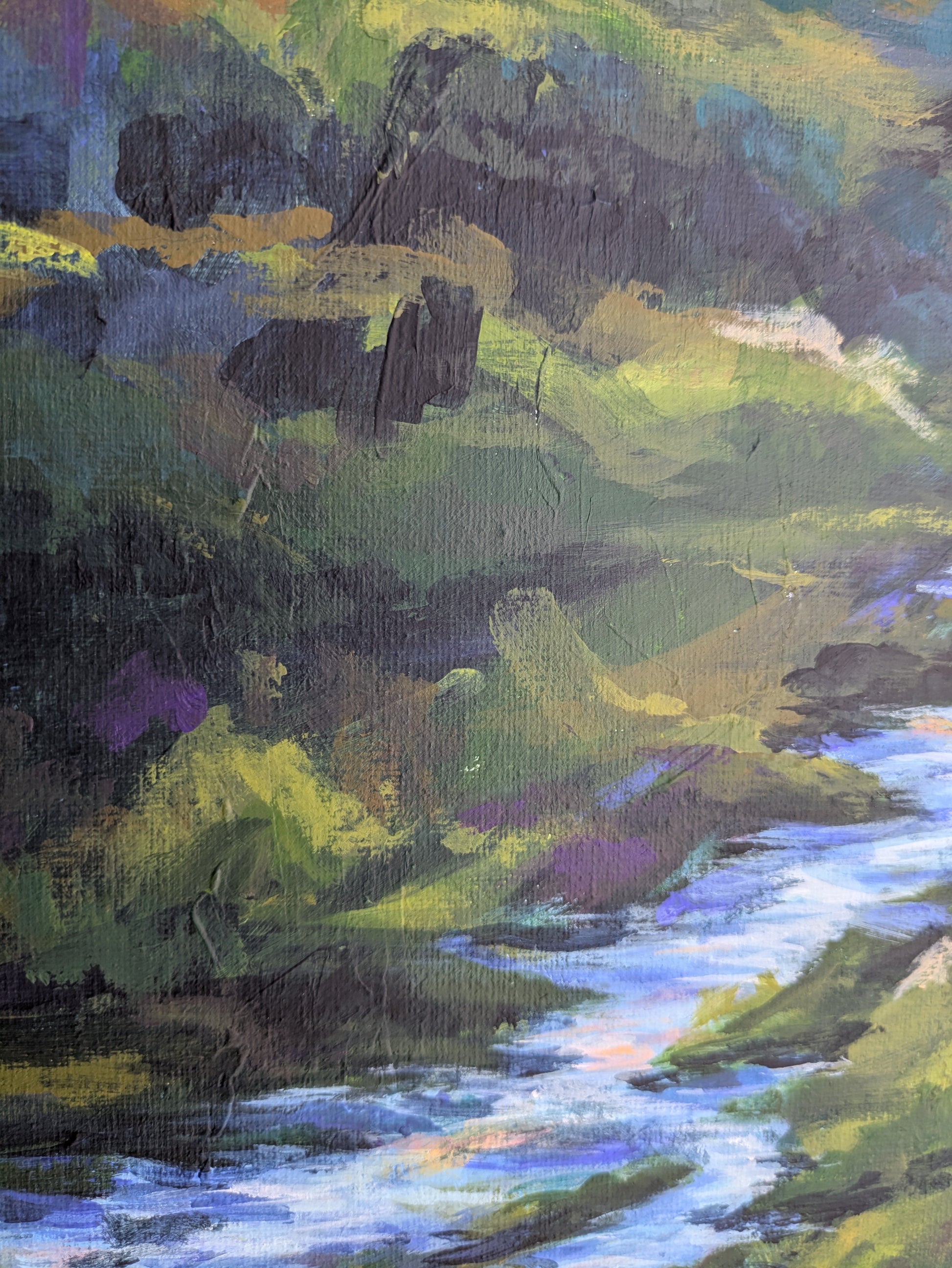 Discover Rugged Sanctuary, a lively exploration of nature's untamed beauty. Bold gestural brushstrokes dance across the canvas full of vibrant colours.. A dramatic sunset bathes the rugged landscape, casting everything in warm, joyful light. The calm, winding creek meanders through the landscape, inviting you to explore every corner of this wild terrain. A quiet, unassuming cottage lies tucked away, nestled in the greenery - a true sanctuary among the vastness of the landscape.