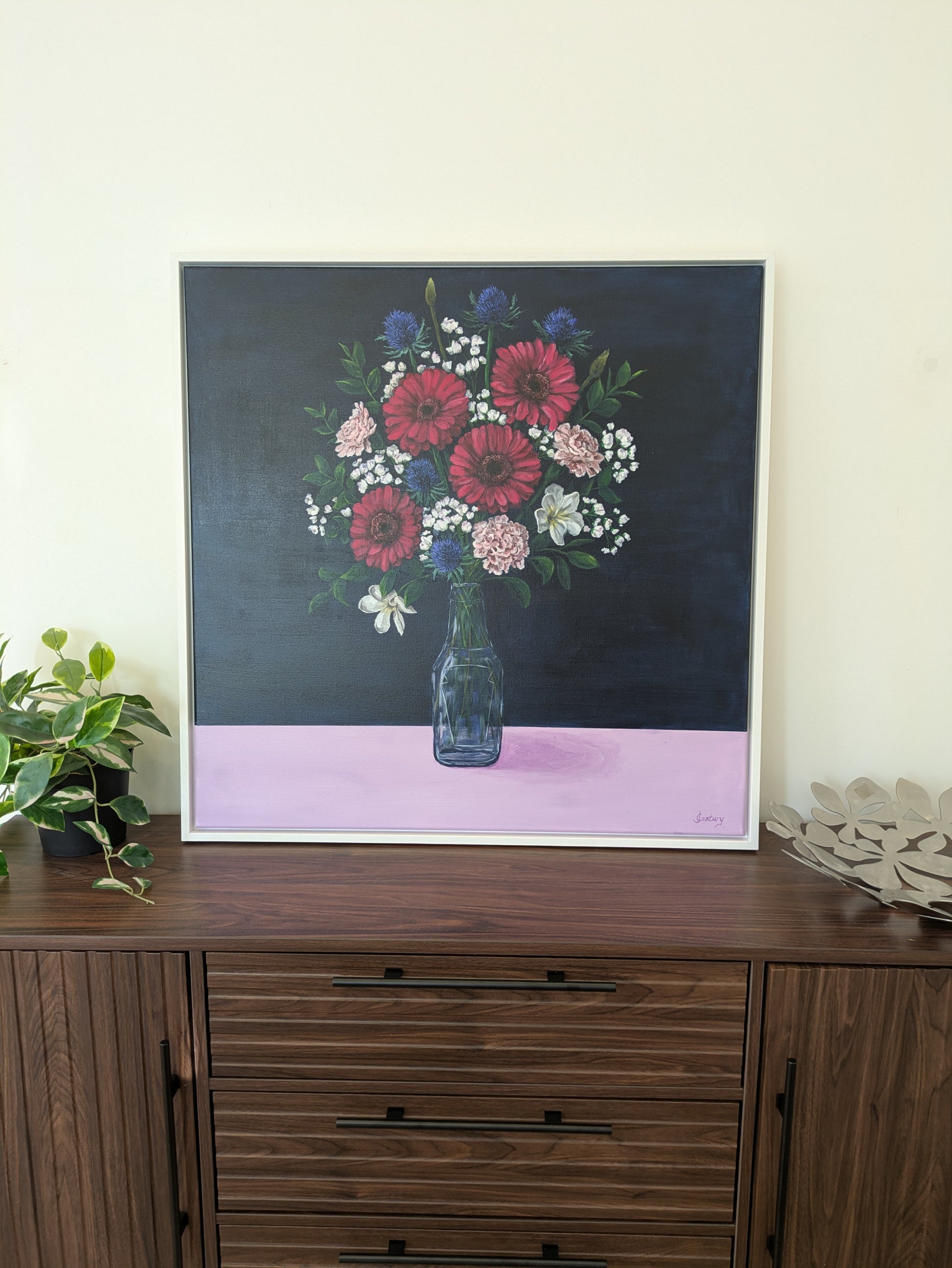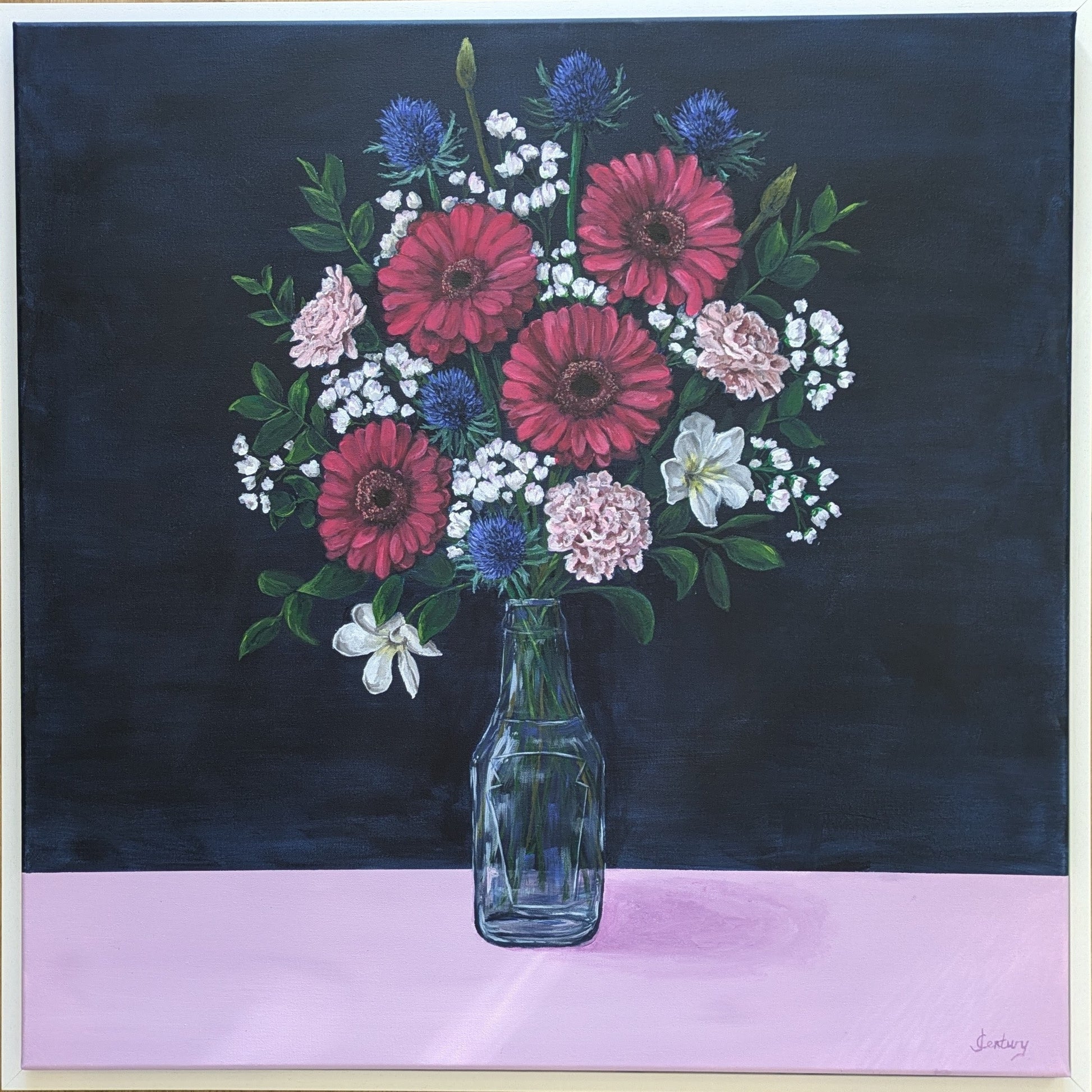 A contemporary flower bouquet painted as a commission for a client. The painting includes special memories and references. This bouquet includes the client's wedding flowers, the flower from their hometown, her Grandma's favourite flower, among other personal references. Painted to match and complement bedroom and dressing room colours, this is a truly unique and meaningful painting which was a pleasure to create!